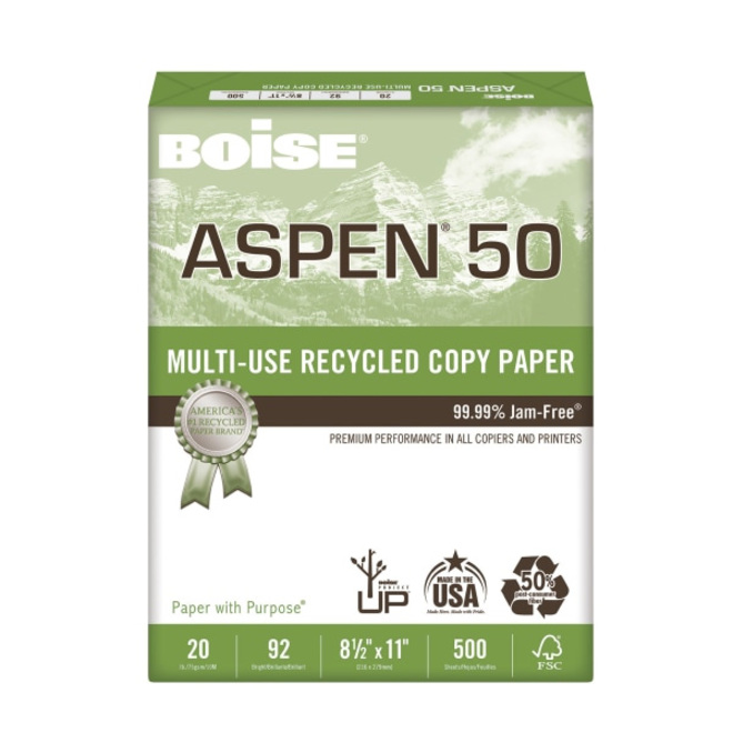 - Boise letter paper is FAC-certified and 50% recycled paper, coming in a ream of 500 sheets. ASPEN 50 multipurpose paper features a professional appearance as well as convenience through machine compatibility.